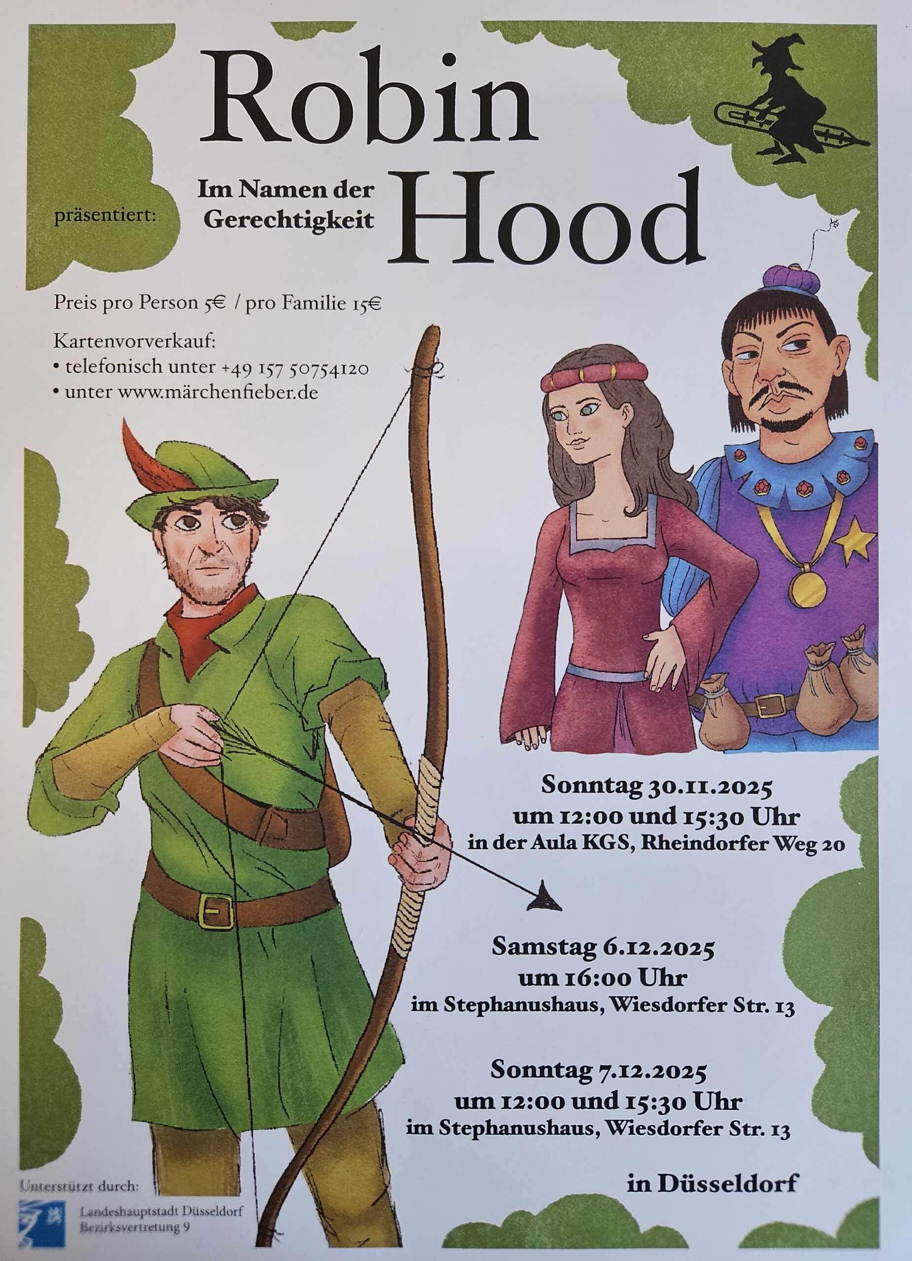 Alle Jahre wieder gibt es in der Adventszeit ein Stück von der Theatergruppe „Märchenfieber“, die seit 20 Jahren Kinder und Erwachsene hier im Stadtteil mit ihrer Spielfreude beglücken. In diesem Jahr steht kein Märchen auf dem Spielplan, sondern es geht auf abenteuerlichen Wege in den Sherwood Forest. Viele kennen die Legende um Robin Hood, doch noch viel spannender ist es, was „Märchenfieber“ daraus gemacht hat. Da wird die Geschichte ganz neu und aktuell aufgearbeitet.